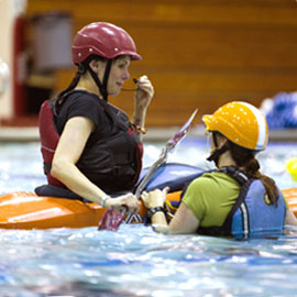 Develop a solid foundation in two 2-hour INDOOR classess. We'll teach proper equipment fit and boat outfitting, comfort underwater, how to exit the kayak after a capsize and how to roll the kayak. You'll work on hip snaps, bow rescues, bracing, and rolling techniques. Be sure to leave time for a social dinner after the lesson!
